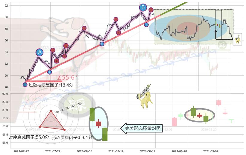 从2021-08-31 14:00至2021-09-09 14:00,共包含41个小时,阶段股价下跌-3.43%,阶段股价变动位移路程比: 1 : 3
