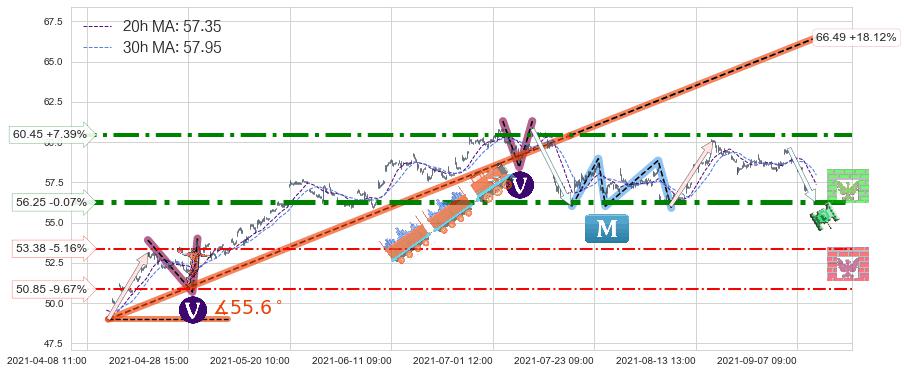 ♞ 20小时均线:57.35,30小时均线:57.95→ 快线<慢线