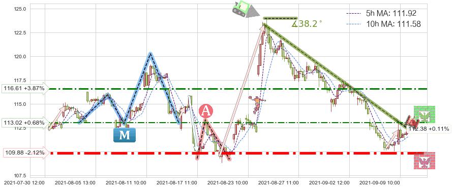 ♘ 阻力价格位113.02,可信任强度47.59%,距离最后交易2021-09-09 14:00形成的收盘价格112.26相差 +0.68%