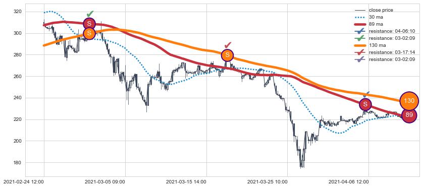 📝 多条均线形成死叉后走势最低价格达到: 134.75