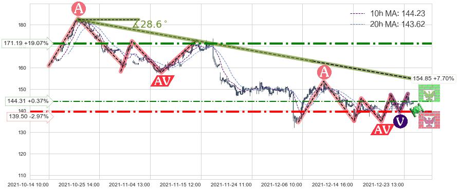 ♘ 阻力价格位144.31,可信任强度49.10%,距离最后交易2021-12-27 15:00形成的收盘价格143.77相差 +0.37%