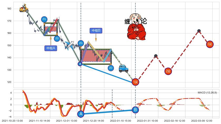 ➢ 缠论中枢点:下降缠中枢B破位后距离1买距离较远,随后猜想后续持续下跌(趋势跟踪)