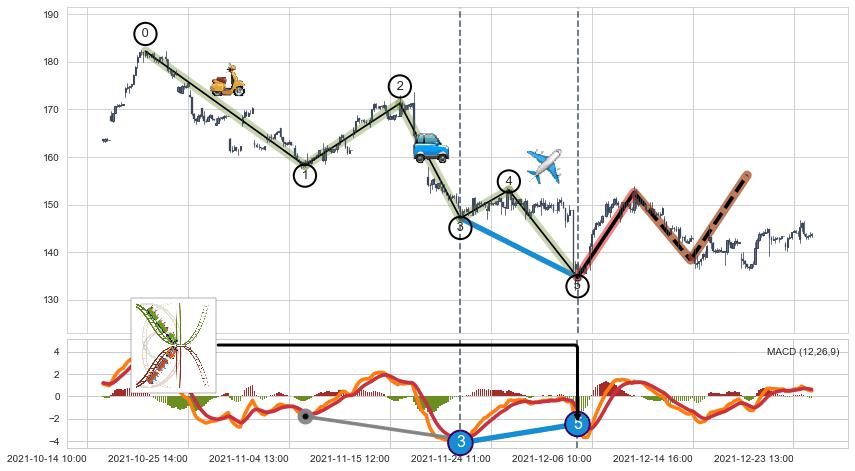 ➣ 波浪理论:猜想达到c点后小反弹终止反转下跌 → 下跌 → 【拐点】临近 → 阶段均值回复结束后继续大周期趋势跟踪