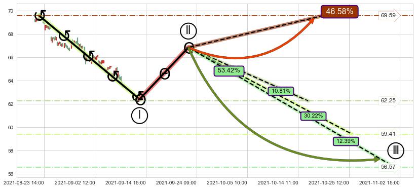 ➣ 5.1: 预测当前第5浪位置(09-09:14, 63.57),仍然有下跌空间