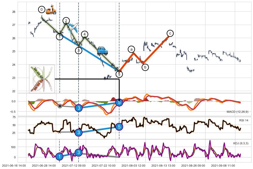 从2021-07-23 10:00至2021-08-03 14:00,共包含47个小时,阶段股价上涨9.36%,阶段股价变动位移路程比: 1 : 2,2021-08-03 09:00向⇪形成缺口,跳空上涨+5.63%