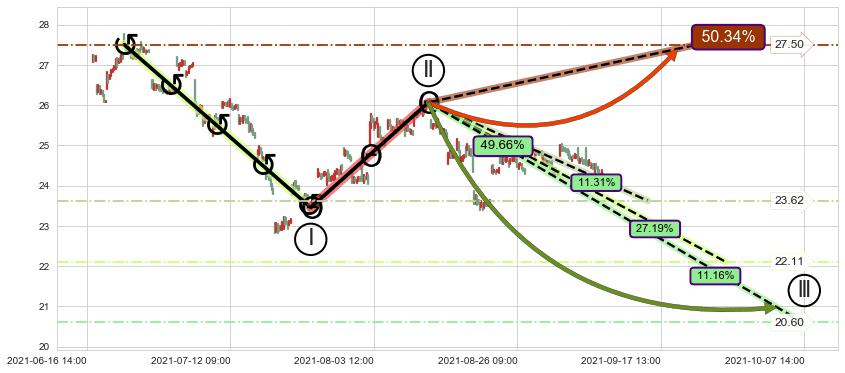 从2021-06-23 09:00至2021-07-26 13:00,共包含140个小时,阶段股价下跌-12.05%,阶段股价变动位移路程比: 1 : 5,下跌趋势角度: 66.6