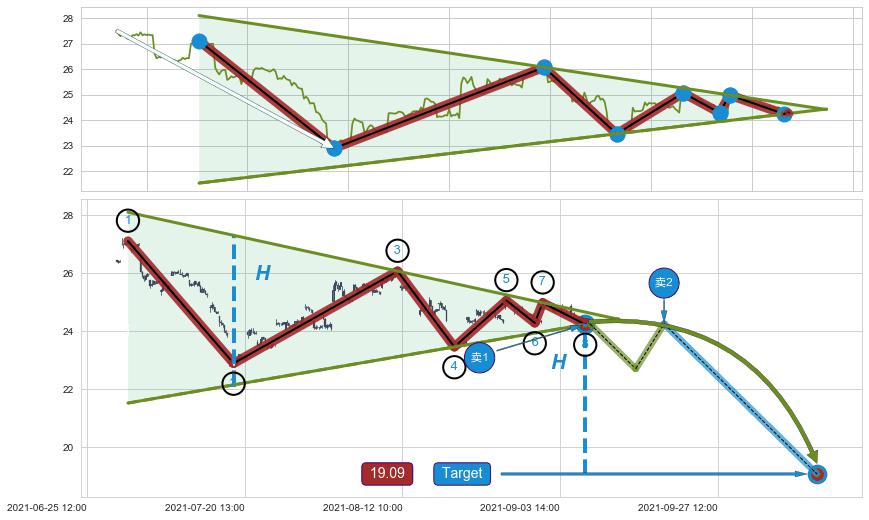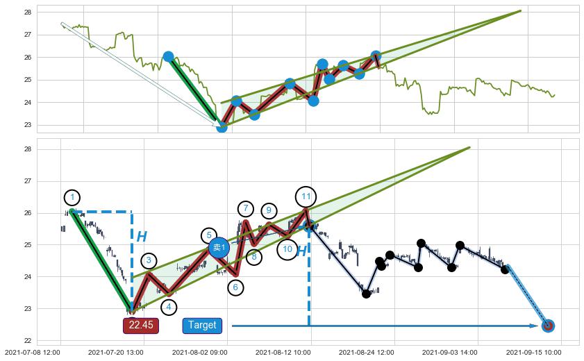 ➢ 最小中继整理跌幅→𝐇: 5.15 (低点逐步抬高斜边第一支撑点②与阻力边垂直距离)