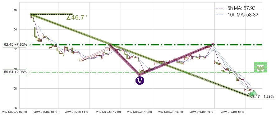 ♘ 阻力价格位59.64,可信任强度38.07%,距离最后交易2021-09-09 14:00形成的收盘价格57.92相差 +2.98%