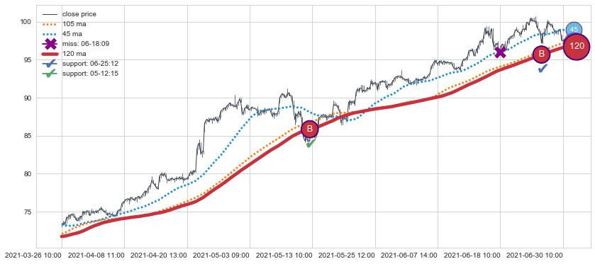 ➢ 21小时均线于(07-06 13:00: 97.23)形成【金叉】基于【金叉历史模型】预测金叉后最高波峰价格: 98.72, 金叉后最高价格130.27,已经上涨超出预测最高波峰价格, 预期回调