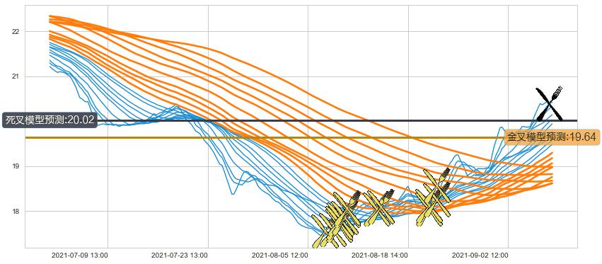 ➢ 10小时均线于(09-09 12:00: 20.36)形成【死叉】基于【死叉历史模型】预测死叉后最低波谷价格: 20.02, 死叉后最低价格20.40,已经下跌超出预测最低波谷价格, 预期反弹