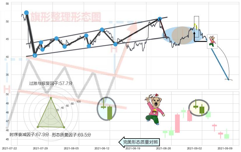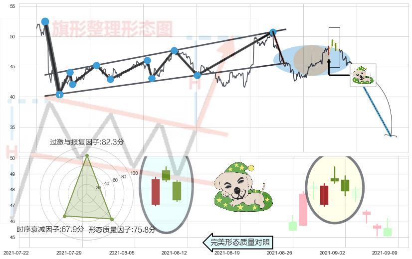 ➢ 看跌(高位倒锤头)流星线 🔜 升旗形支撑破位转换阻力下跌 综合量化分数:43.12 【偏空】