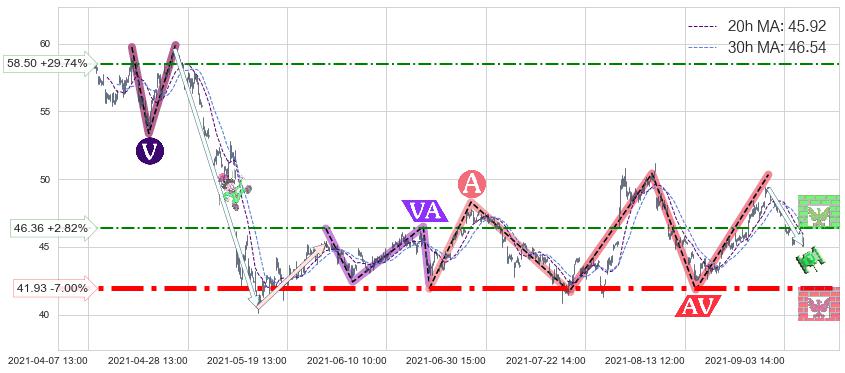 ♘ 支撑价格位41.93,可信任强度94.46%,距离最后交易2021-09-09 14:00形成的收盘价格45.09相差 -7.00%