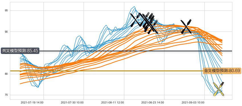➢ 30小时均线于(08-13 14:00: 92.70)形成【死叉】基于【死叉历史模型】预测死叉后最低波谷价格: 88.05, 死叉后最低价格73.96,已经下跌超出预测最低波谷价格, 预期反弹