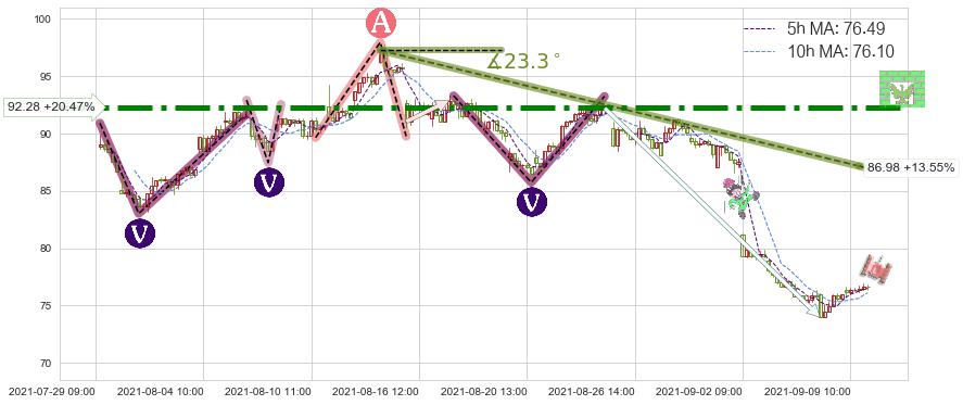 ♘ 阻力价格位92.28,可信任强度99.45%,距离最后交易2021-09-09 14:00形成的收盘价格76.60相差 +20.47%