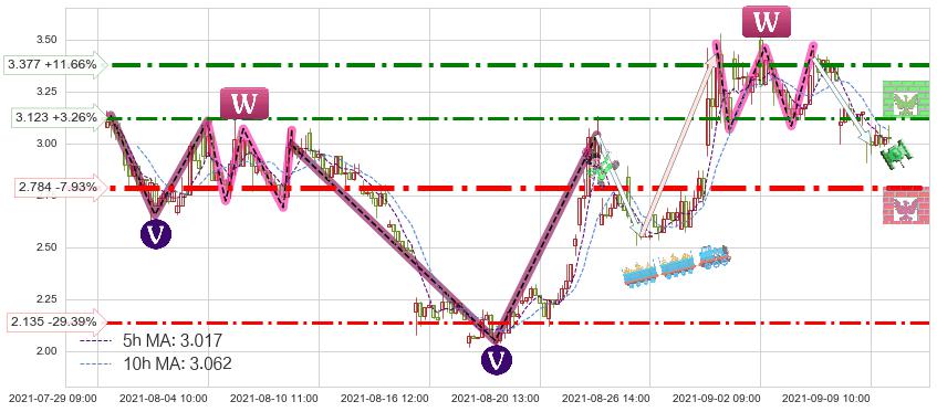 ➣ 【已确认突破】最后价格:3.024与最小【反转】第一目标价格→(09-10:12: 2.799 )相较: 下跌空间【较大】