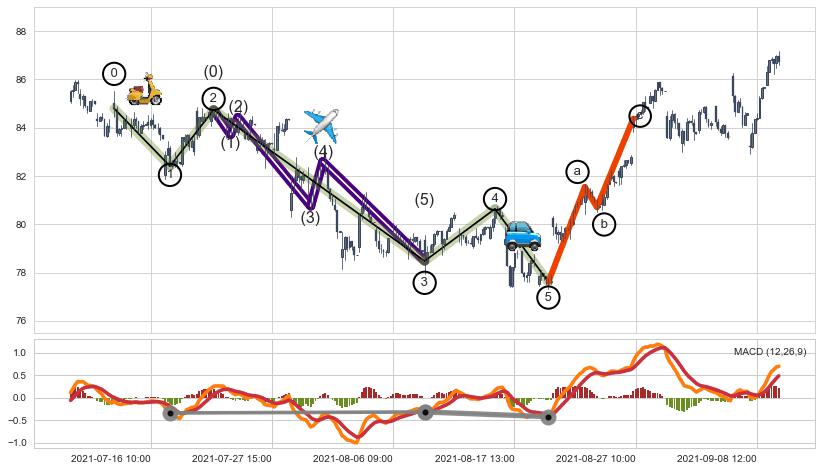 ➢ 波浪理论:猜想击穿突破c点后继续上涨 → 上涨 → 机会信号 → 小趋势跟踪