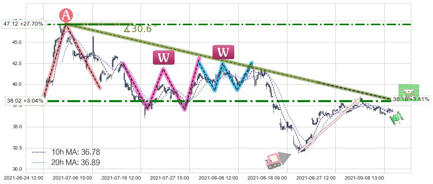 🦴 长线均值回复组合短线趋势跟踪[强阻力信号]2021-06-29 15:00-2021-08-24 15:00下跌趋势依然成立(下跌趋势跟踪依然存在),短线价格略微上行反弹(均值回复猜想),即将接近下跌趋势提供的未破位阻力价格:38.16。