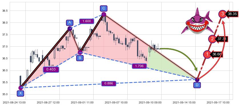 ➢ 距离预测D点位置尚有下跌空间,短线依然【看跌】, 耐心等待看涨【鲨鱼】形态反转启动