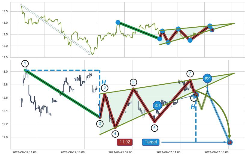 ➢ 下降对称三角整理与缠论中枢点信号事件周期长度级别相同,同周期信号事件