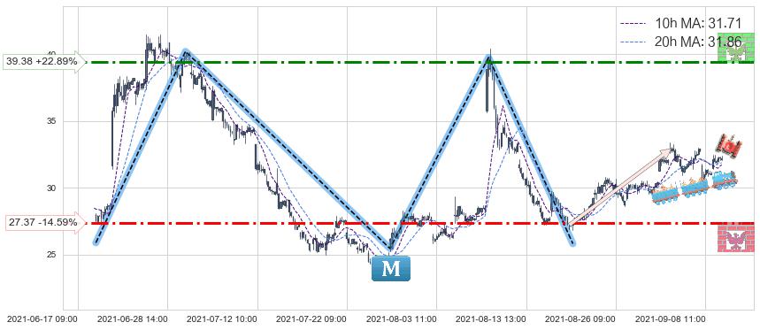 ♘ 阻力价格位39.38,可信任强度57.18%,距离最后交易2021-09-09 14:00形成的收盘价格32.05相差 +22.89%