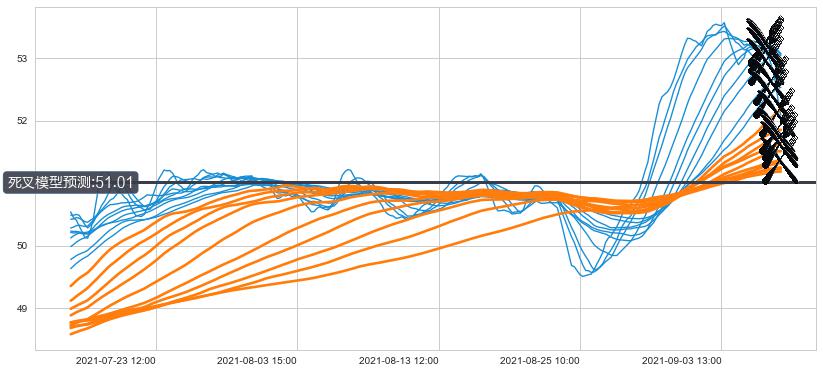➢ 70小时均线于(09-09 12:00: 52.10)形成【死叉】基于【死叉历史模型】预测死叉后最低波谷价格: 51.02, 死叉后最低价格51.35,尚未达到预测最低波谷价格, 预期继续下跌