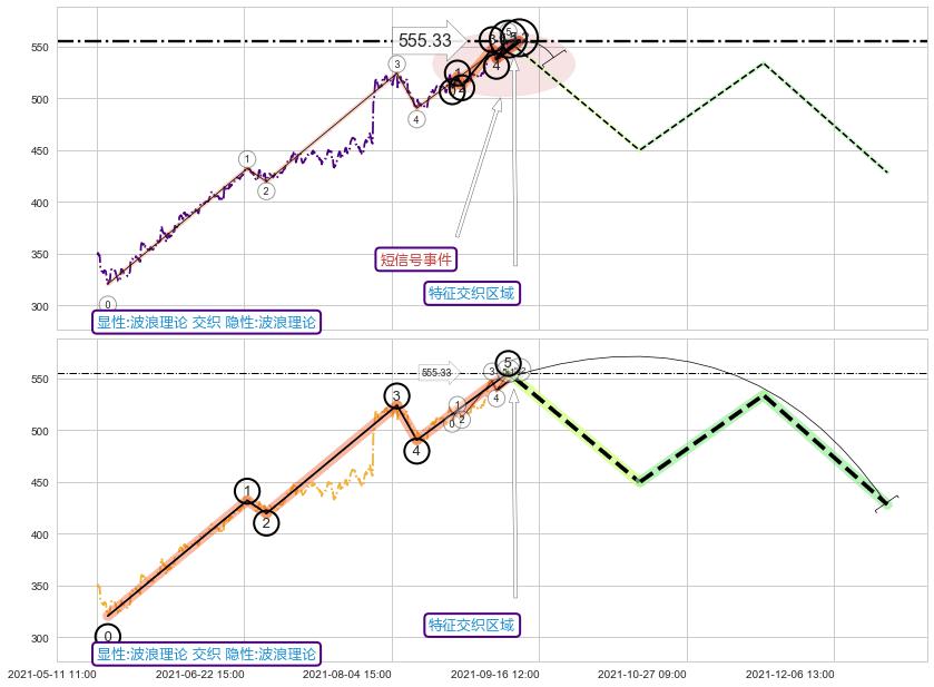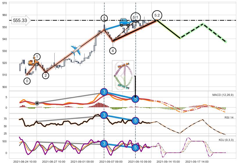 ➣ 5.1: 预测当前第5浪位置(09-08:11, 555.28),仍然有上升空间