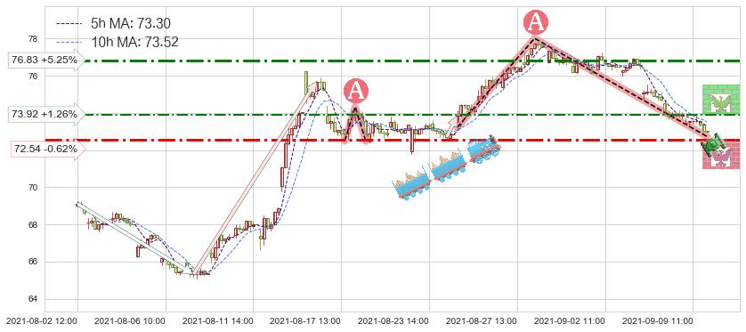 ♘ 阻力价格位73.92,可信任强度40.22%,距离最后交易2021-09-09 15:00形成的收盘价格73.00相差 +1.26%