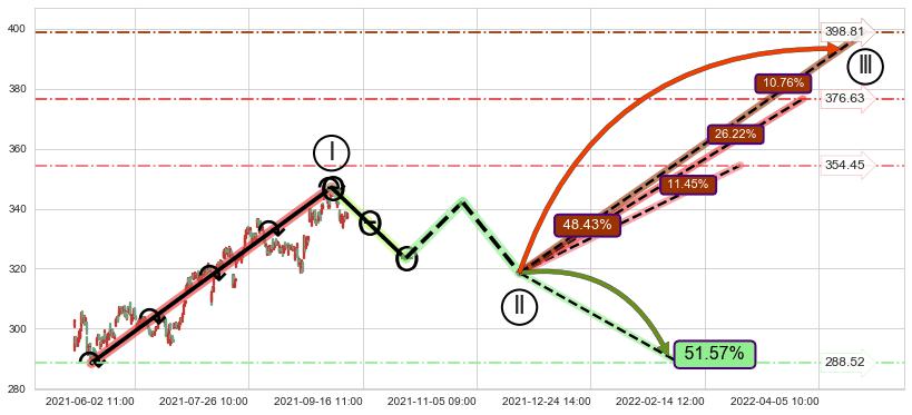➢ 循环浪继续向上【最高】位置(04-25:13, 398.81),匹配聚类样本比例22.21%, 可能性概率10.76%