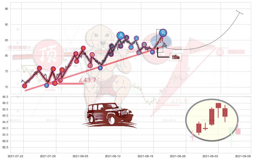 从2021-08-24 09:00至2021-09-09 14:00,共包含75个小时,阶段股价上涨1.28%,阶段股价变动位移路程比: 1 : 17