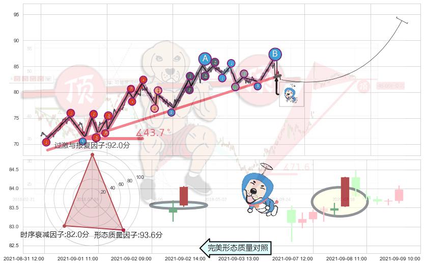 ♘ 在最后的上升阶段2021-04-12 09:00至2021-09-03 14:00存在 破位边缘的支撑位 ,支撑价格83.23,支撑可信任强度78.08%,其距离最后价格82.43相差 +0.98%