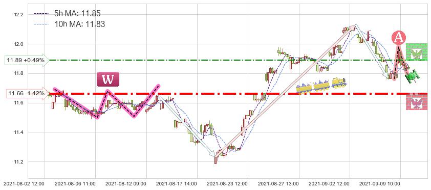 ♘ 阻力价格位11.89,可信任强度46.70%,距离最后交易2021-09-09 14:00形成的收盘价格11.83相差 +0.49%