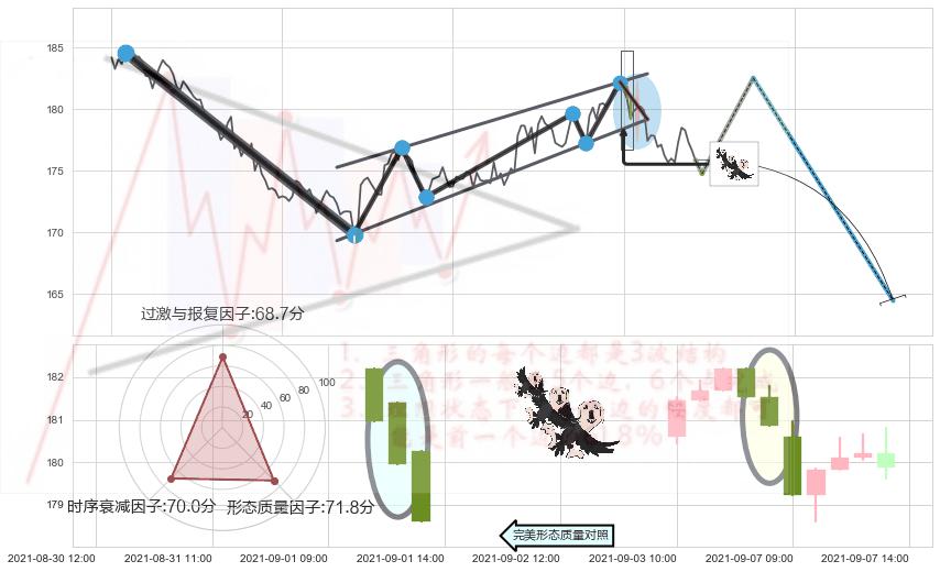 从2021-08-03 09:00至2021-08-30 09:00,共包含123个小时,阶段股价下跌-4.08%,阶段股价变动位移路程比: 1 : 10,下跌趋势角度: 67.3
