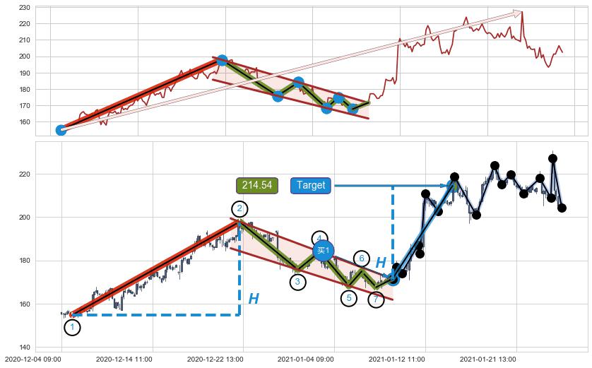从2021-01-27 16:00至2021-01-28 16:00,共包含9个小时,阶段股价上涨4.68%,阶段股价变动位移路程比: 1 : 1.9