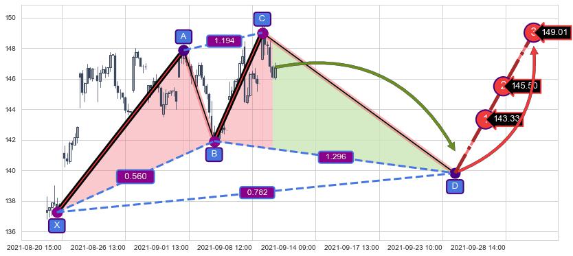 ➢ 距离预测D点位置有足够的下跌空间, 与看涨【赛福】形态相反,实际方向【看跌】