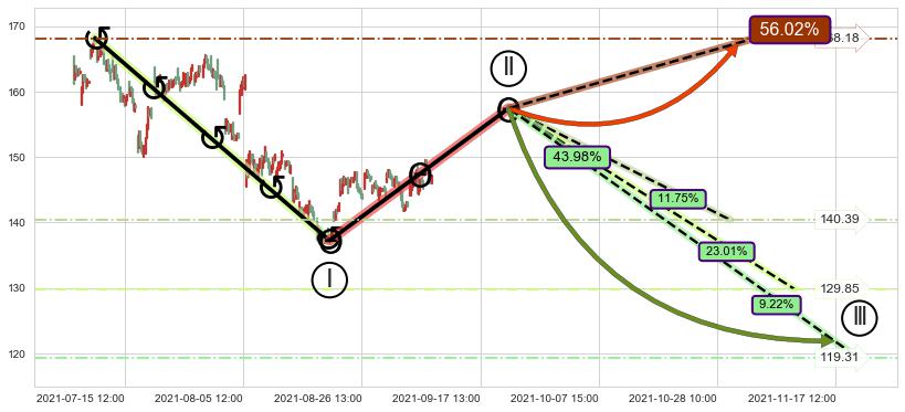 ➣ D点拟合预测价格139.82,距离最后交易收盘价格146.74相差 -4.71%