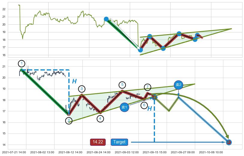 从2021-05-13 12:00至2021-06-23 14:00,共包含186个小时,阶段股价上涨7.36%,阶段股价变动位移路程比: 1 : 15