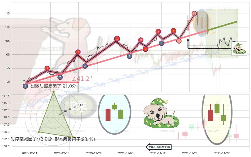 从2020-12-28 16:00至2021-01-20 16:00,共包含109个小时,阶段股价上涨17.69%,阶段股价变动位移路程比: 1 : 3,上涨趋势角度: 42.4