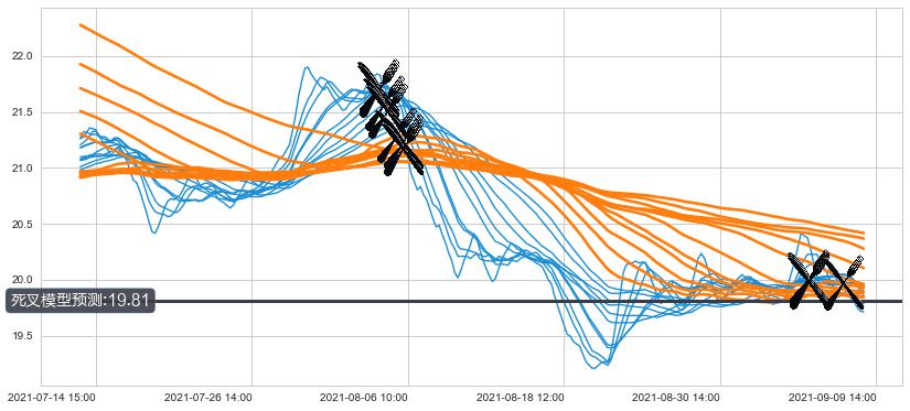 ➢ 13小时均线于(08-04 12:00: 21.71)形成【死叉】基于【死叉历史模型】预测死叉后最低波谷价格: 20.82, 死叉后最低价格19.11,已经下跌超出预测最低波谷价格, 预期反弹