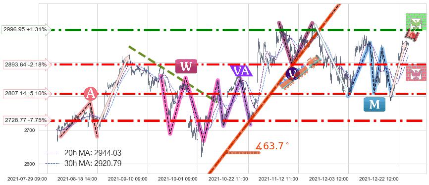 ♘ 阻力价格位2996.95,可信任强度93.78%,距离最后交易2021-12-27 15:00形成的收盘价格2958.13相差 +1.31%