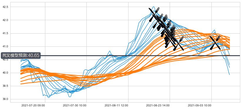 ➢ 60小时均线于(08-23 09:00: 41.62)形成【死叉】基于【死叉历史模型】预测死叉后最低波谷价格: 40.92, 死叉后最低价格39.78,已经下跌超出预测最低波谷价格, 预期反弹
