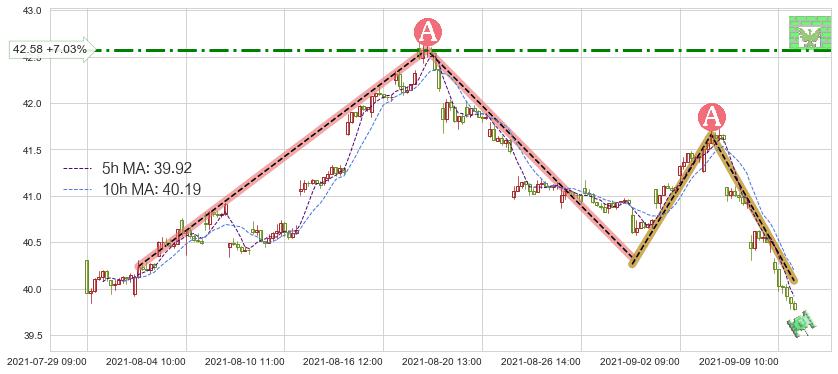 ♘ 阻力价格位42.58,可信任强度58.95%,距离最后交易2021-09-09 14:00形成的收盘价格39.78相差 +7.03%