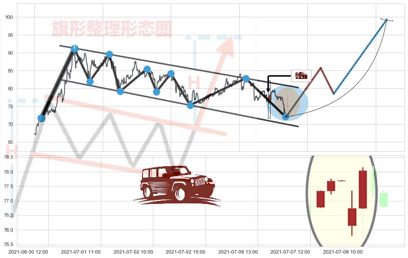 ➣ 降旗形:猜想临近关键阻力位突破点 → 临近拐点上涨 → 机会信号 → 大趋势均值回复