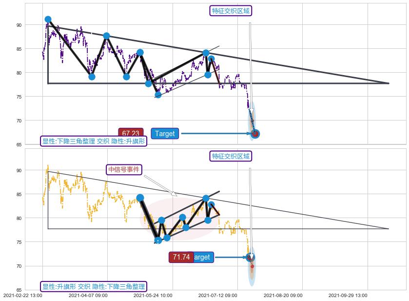 ➣ 下跌螺旋桨 + 下降三角整理支撑破位转换阻力下跌信号叠加后【目标达成率】中等,【看空】信号叠加【存续影响中等】