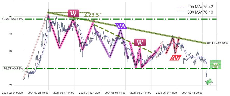♘ 阻力价格位74.77,可信任强度75.55%,距离最后交易2021-07-19 15:00形成的收盘价格72.08相差 +3.73%