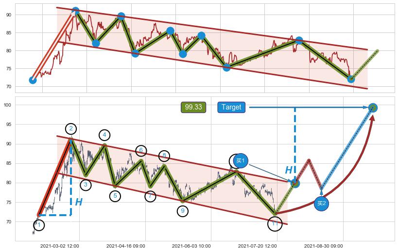 ➣ 升旗形:猜想下跌target达成后 → 上涨 → 机会信号 → 大趋势均值回复