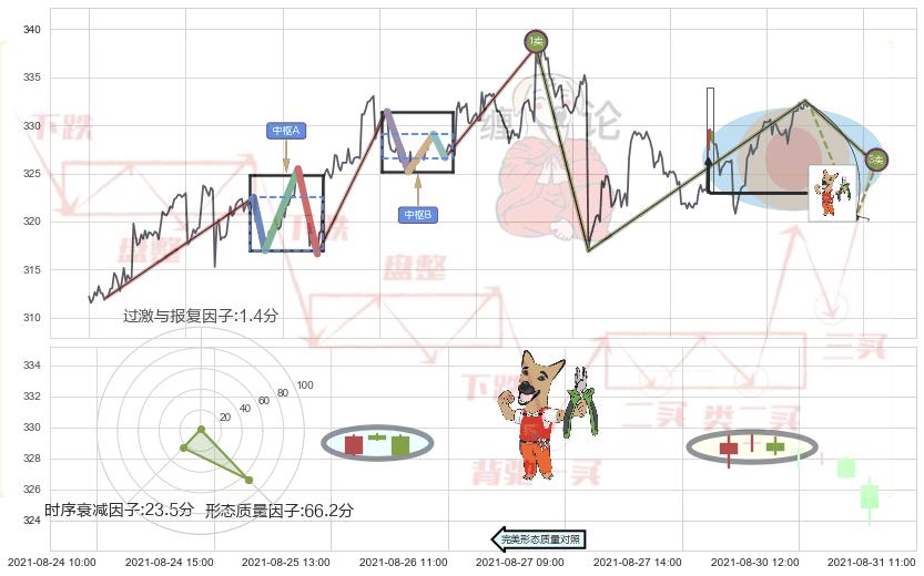➣ 【中枢B】:07-26:15-08-02:10,中枢由4笔构成,共31交易小时, ZG=329.06, ZD=326.60