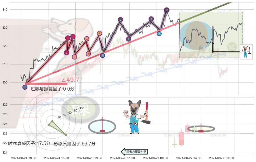 从2021-06-18 09:00至2021-08-16 14:00,共包含283个小时,阶段股价上涨11.36%,阶段股价变动位移路程比: 1 : 6,上涨趋势角度: 49.7