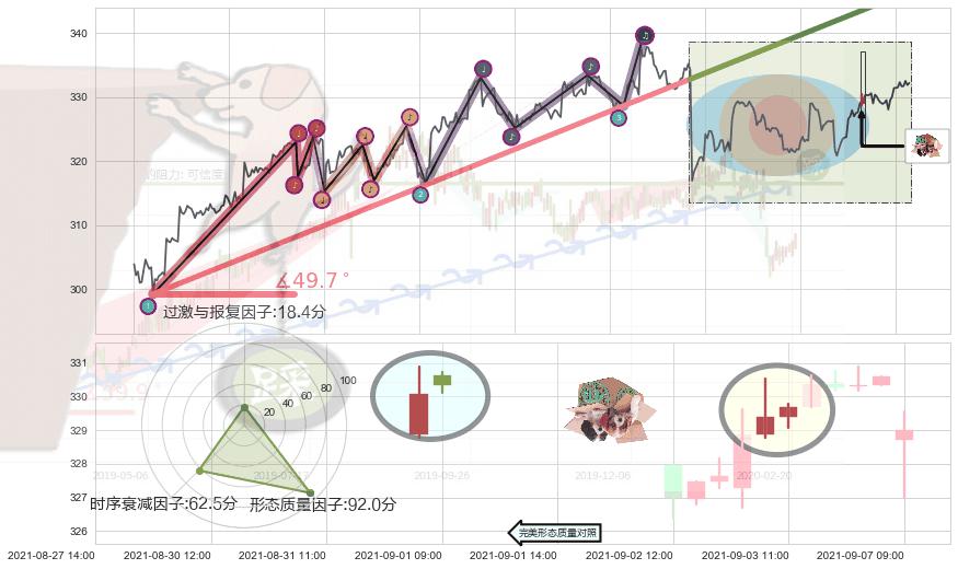 ➣ 2021-06-18 09:00-2021-08-16 14:00上升趋势存在反转[风险],其原上升趋势的支撑位(346.53)已破位[强阻力信号],原上升趋势角度: 49.7˚