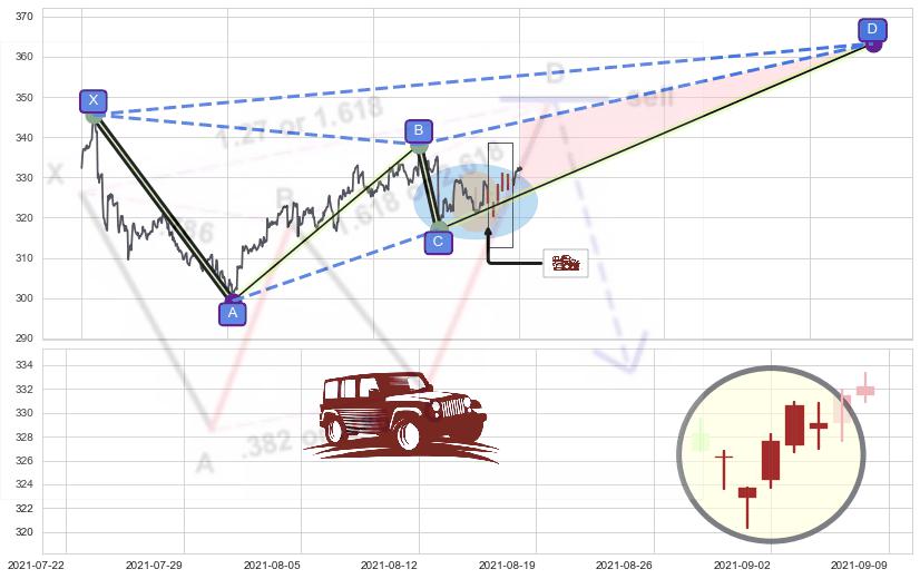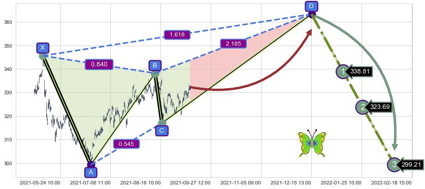 ➣ 谐波蝴蝶:b下跌接近c:猜想支撑性拉升 → 上涨 →【拐点】支撑临近 → 大趋势均值回复