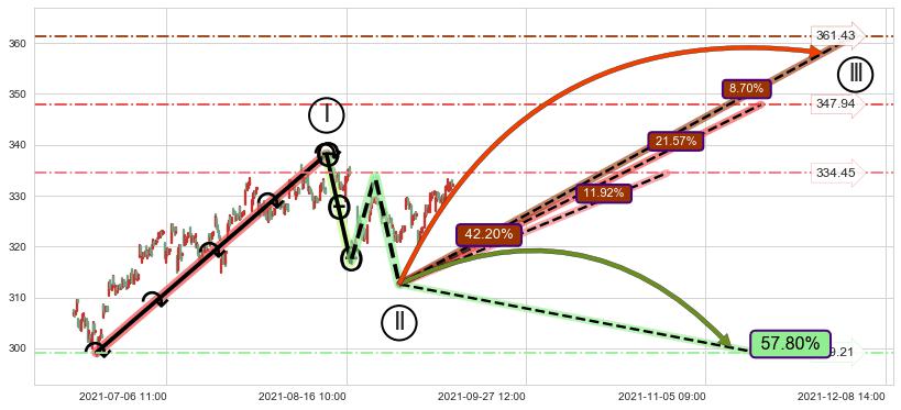 ➣ 高概率大级别循环上涨浪被破坏,反转向下(突破5浪起点)概率57.80%